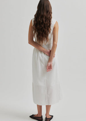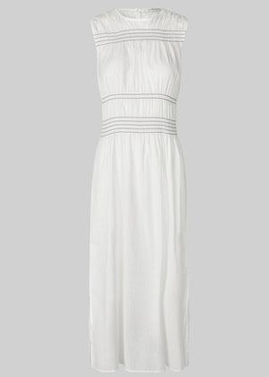AVIDA is a sleeveless contrast dress. The dress is made in light organic cotton. Featuring a round neck and concealed zip fastening at the back. Shirred sections at the top and waist in contrasting colour. Slits at sides. Lined to the knees. Slim fit at the top with a looser skirt.