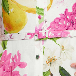 BECCA is a short-sleeved dress in midi length. This dress features blossoms and pears tangled together on a soft canvas. Fresh, whimsical, and just a little nostalgic like orchard days in bloom.
