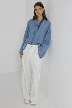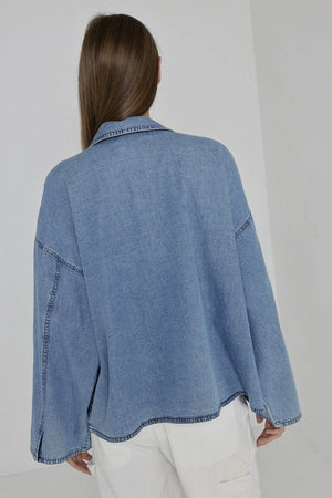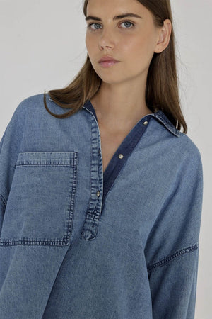 Phoebe is a casual denim blouse. Its long sleeves and shirt collar create a modern oversized silhouette. Look casual and on-trend with the Phoebe blouse in fine denim.