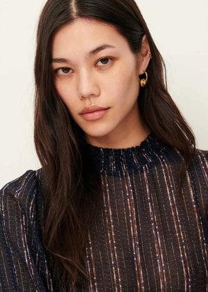 DUCHESS is a blouse with balloon sleeves in a silk and viscose chiffon crepe print with fine metallic stripes, exclusive Sessùn pattern.