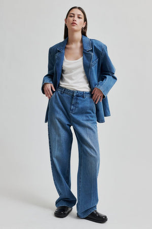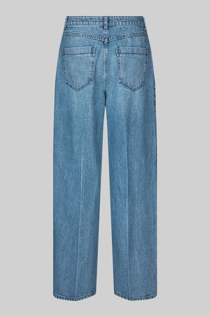 Everly is a wide-leg denim jean. Made in cotton denim with worn blue wash and tonal stitching. Featuring a concealed zip and hook fastening.