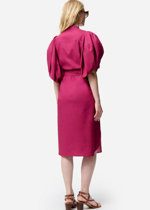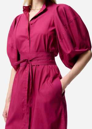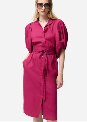FLORA is a printed cotton and lyocell midi dress. This Flora dress embodies feminine, structured elegance. Its waist is accentuated by a tone-on-tone belt that subtly highlights the silhouette. With short puff sleeves and a buttoned neckline, it combines classic style with a modern twist. Perfect for a sophisticated look from morning to night.