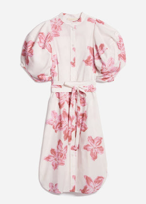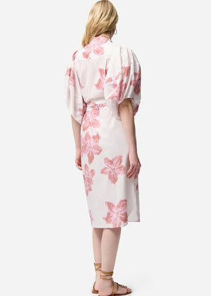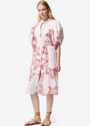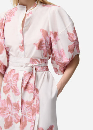 FLORA is a printed cotton and lyocell midi dress. This Flora dress embodies feminine, structured elegance. Its waist is accentuated by a tone-on-tone belt that subtly highlights the silhouette. With short puff sleeves and a buttoned neckline, it combines classic style with a modern twist. Perfect for a sophisticated look from morning to night.