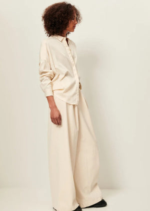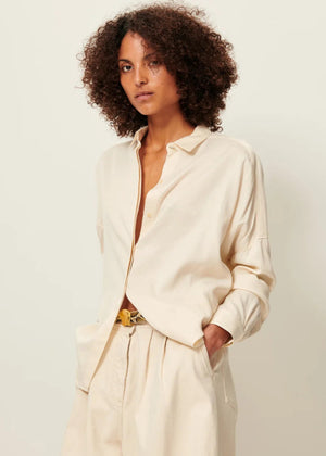 LADY D is a loose-fitting shirt with drop shoulders in a cupro satin fabric.