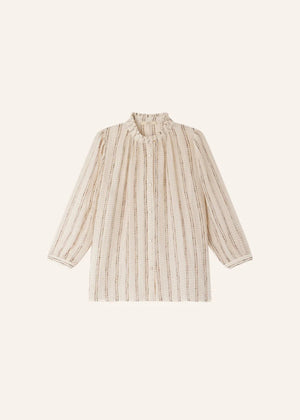 Lylee is a blouse with a ruffle collar in a viscose silk chiffon crepe print, with fine metallic stripes, exclusive Sessùn pattern.