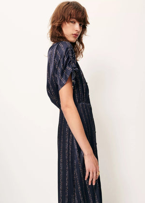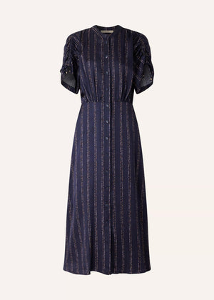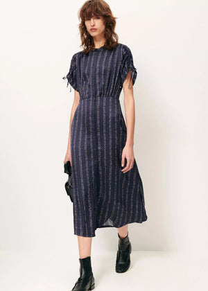 NOBLONG is a long button-up midi dress with gathering details and a drawstring on the sleeves in fluid viscose satin, printed in Italy, exclusive Sessùn pattern.