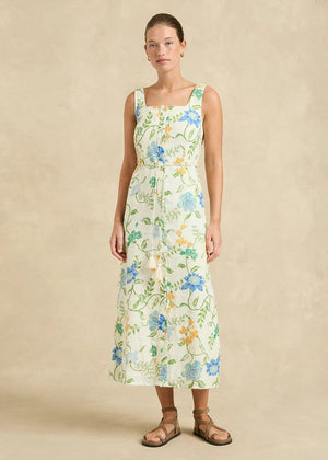 PALOMA is a printed linen, a-line midi dress. Designed with a flattering square neck and fitted bodice that flows to an A-line silhouette, this linen midi sundress is the perfect companion for city wanderings and sunset drinks.