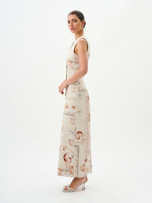 Rendered in light weight linen fabrication, the Quinn Dress offers a relaxed yet flattering form. Adorned in the ROAME exclusive, Vintage Treasures print featuring functional front buttoning and a centre split.