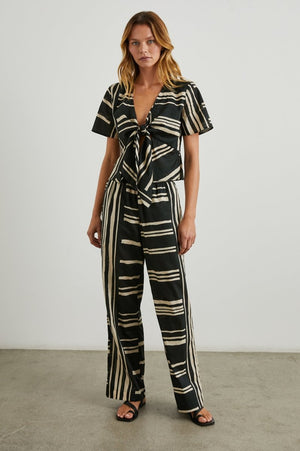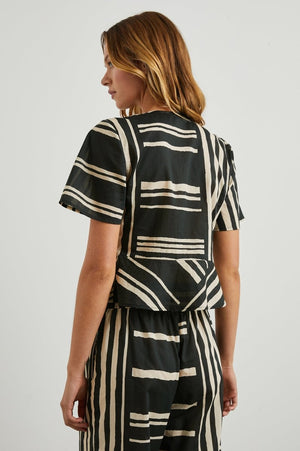 Tia is a printed short sleeves top. It's vacation time with the Tia. Lightweight beach cotton keeps you cool, while a peplum hem and customizable front-tie ensures an airy fit. Style with high-waisted shorts to keep things casual, or pair with the Beech Skirt in Island Stripe for a vacation look you will keep coming back to.