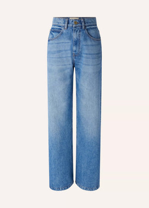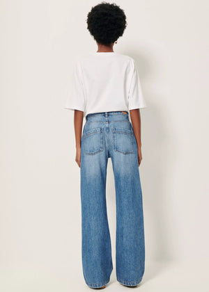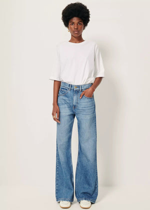 SAILNIM is a mid-rise wide-leg flared jeans in authentic-look stonewash denim.