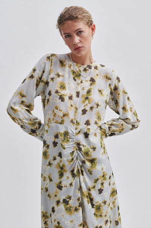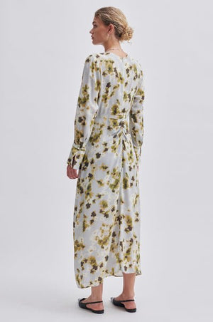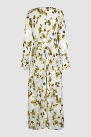 ANDRA is a maxi dress. Made in smooth viscose with soft, drapy quality and all-over floral pattern. Featuring a round neck and concealed zip fastening at the back. Long sleeves with wide cuffs with button fastening and slits at ends. Gathers at front and back to create flattering draped effect. Deep slit at front. Lined body to knee and unlined sleeves. Regular fit at top with fluid skirt.