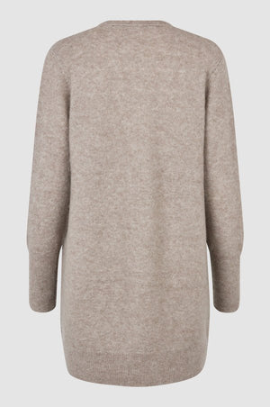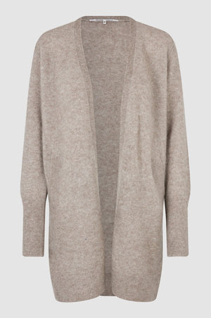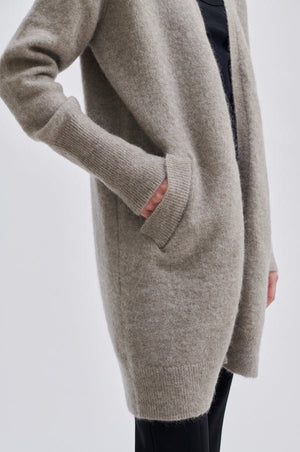 BROOK KNIT is a extra-long cardigan. Made in a soft and stretchy mohair-wool blend with slightly fluffy texture. Featuring an open front with ribbed trim at all edges. Slightly dropped shoulders with long sleeves and wide ribbed trim at cuffs. Two slanted pockets with ribbed trim. Long with relaxed, straight fit.
