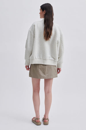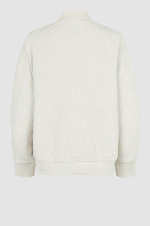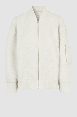 GROOVY BOMBER is a bouclé bomber jacket. Made in bouclé blend fabric with slightly bobbly texture. Featuring a round neck and zip-through fastening at the front. Dropped shoulders and pleated detail at back of shoulder seams. Ribbed neck, cuffs and bottom hem. Two slanted pockets. Fully lined. Oversized fit.