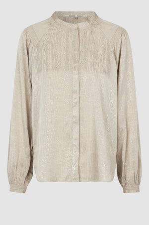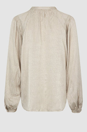 HAVEN is a button-up shirt. Made in soft, drapy viscose with tonal shiny pattern. Featuring mandarin collar and placket at the front with concealed button fastening. Long sleeves with elasticated details at shoulders and cuffs. Button fastening at cuffs. Loose and fluid fit.
