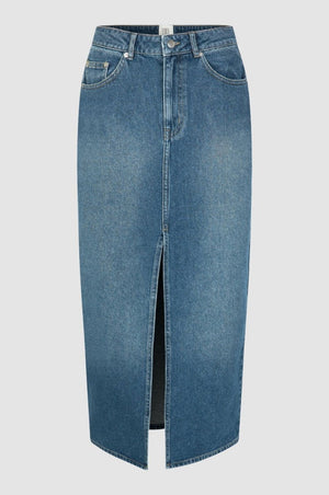 KYLIE is a midi denim skirt. Made in mid blue cotton denim with vintage look and contrast stitching. Featuring a concealed zip and button fastening at the waist. Five-pocket style. Deep slit at the front. Regular fit with straight, streamlined silhouette.