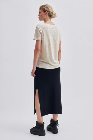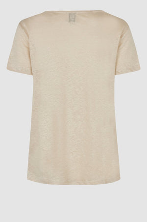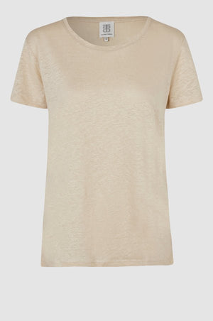 PEONY is a scoop-neck tee. Made in light linen with uneven structure. Featuring a slightly scooped neck and short sleeves. Twin stitching at bottom hem. Relaxed fit.