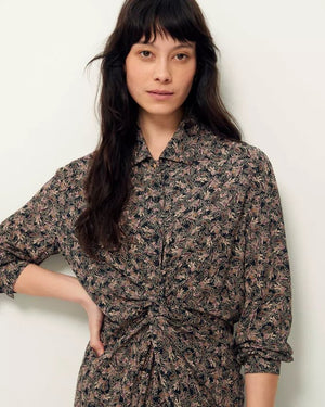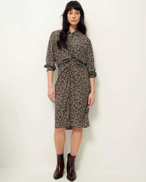 HOLDINA is a mid-length buttoned shirt dress with front tie detail in a lightweight, fluid viscose print fabric, exclusive Sessùn pattern.
