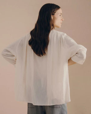 STAEL is a gathered wide button-down shirt in thin striped jacquard antic lawn woven in France, exclusive to Sessùn.