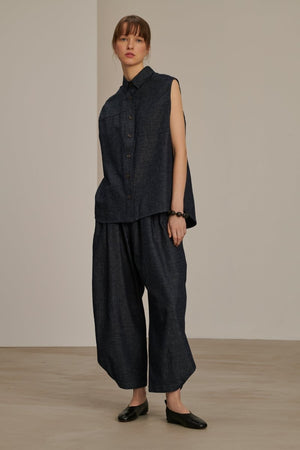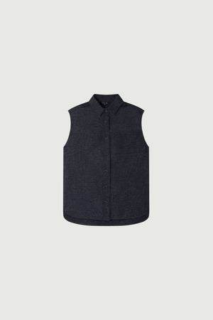 CHARLOTTE is a denim sleeveless button-down shirt.