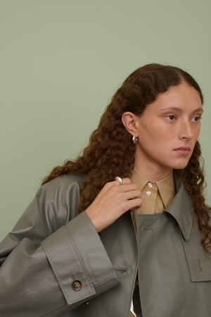 MINI is an stud earrings set defined by a sculptural, rounded design, broken in places as if to lighten its forms. The collection includes a bangle bracelet to wear over a jumper, a massive ring, and earrings.