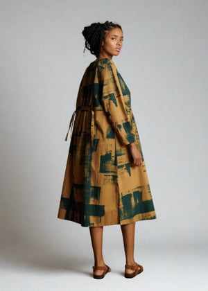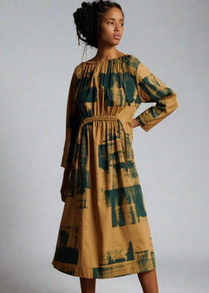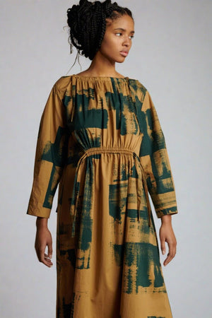 UYUNI Dress is a beige and blue printed cotton poplin dress featuring tightened wrists, low armholes, gathered neckline, slit side(s), tie(s) at neckline, Drawstring(s), Long sleeves, Elasticated waist, Wide sleeves, Gathered at the waist.