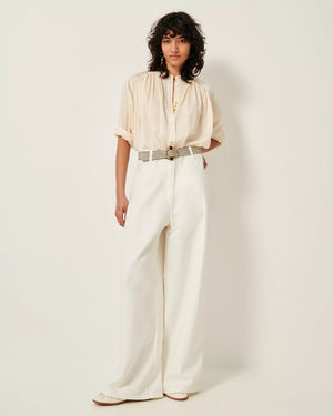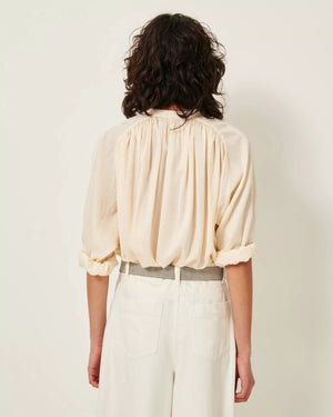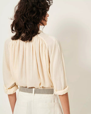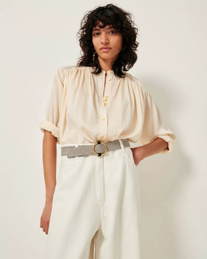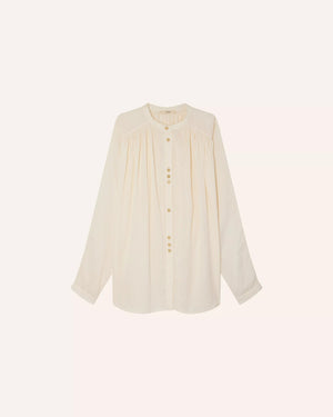 Stalight is a loose-fitting shirt in cream with gathering in antique-style lawn fabric with tone-on-tone stripes in textured-weave.