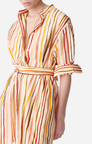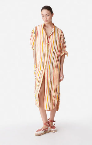 CANDRIC is a shirt dress. It features a whimsical and modern pattern boasting summery colors. Ideal for an outdoor dinner on a summer evening, it is easy to wear. Candric stands out on its own, wear it with espadrilles, and you're all set.