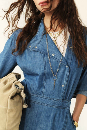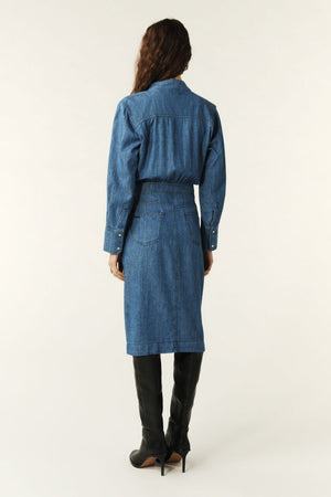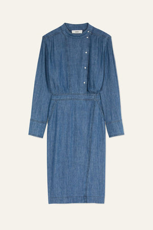 The Wakie Midi Dress features long sleeves, an asymmetrical button placket, a snap button closure, a stand-up collar, Italian side pockets, a fitted waist, an oversized top, and patch pockets at the back. This dress is mid-length and has a fitted silhouette. The dress is a versatile piece that can be styled for a variety of occasions.