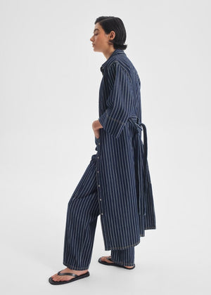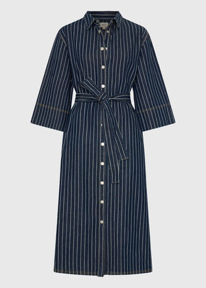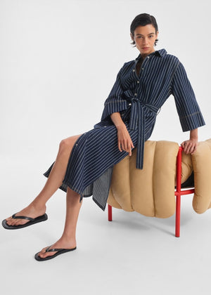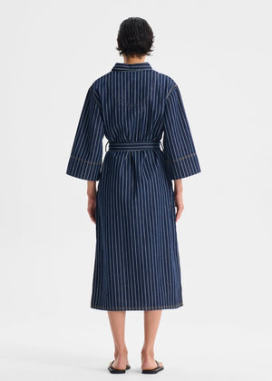 WYATT is a denim midi dress with a classic collar and 3/4 sleeves. This dress features a metal snap front fastening, and dropped shoulders for a relaxed look. Designed with 3/4 length wide sleeves, side seam pockets, and side splits at the midi-length hem. Comes with a self-fabric belt to define the waist.